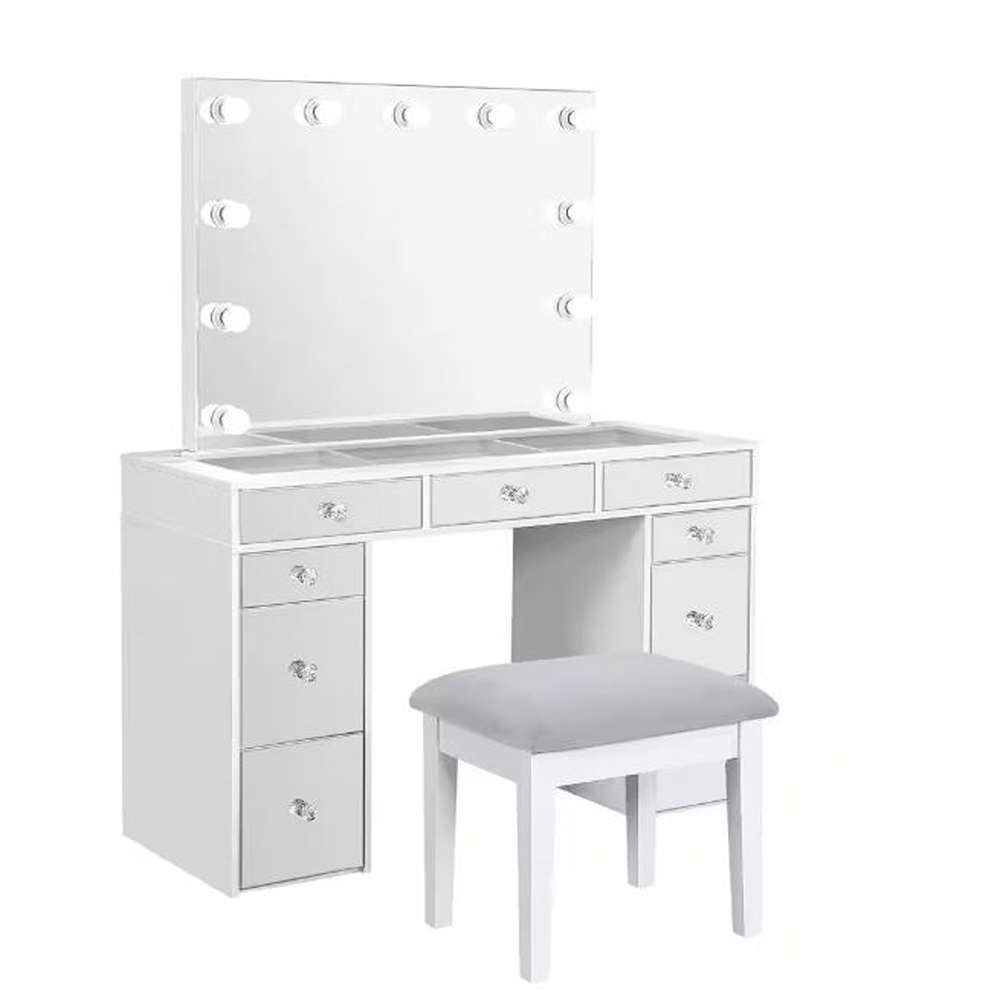 - Includes: One (1) vanity table, one (1) mirror, and one (1) stool